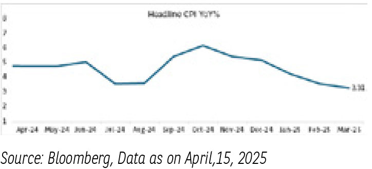 - India CPI inflation eased to 3.3% y/y in March-2025 from 3.6%