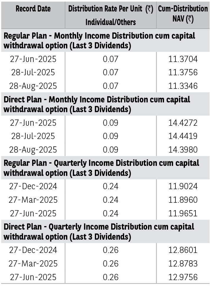 Pursuant to distribution under Income Distribution cum Capital Withdrawal (‘IDCW’) option, NAV of the IDCW option of the scheme(s) would fall to the extent of payout and statutory levy (if applicable). The amounts under IDCW options can be distributed out of investors capital (Equalization Reserve), which is part of sale price that represents realized gains. Past performance may or may not be sustained in future. The above stated distribution rate per unit is net distribution rate after deducting applicable taxes. The above distribution rates are on face value of ₹ 10 per unit.