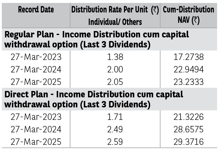 Pursuant to distribution under Income Distribution cum Capital Withdrawal (‘IDCW’) option, NAV of the IDCW option of the scheme(s) would fall to the extent of payout and statutory levy (if applicable). The amounts under IDCW options can be distributed out of investors capital (Equalization Reserve), which is part of sale price that represents realized gains. Past performance may or may not be sustained in future. The above stated distribution rate per unit is net distribution rate after deducting applicable taxes. The above distribution rates are on face value of ₹ 10 per unit.