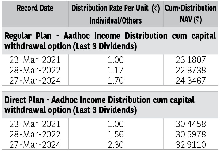 Pursuant to distribution under Income Distribution cum Capital Withdrawal (‘IDCW’) option, NAV of the IDCW option of the scheme(s) would fall to the extent of payout and statutory levy (if applicable). The amounts under IDCW options can be distributed out of investors capital (Equalization Reserve), which is part of sale price that represents realized gains. Past performance may or may not be sustained in future. The above stated distribution rate per unit is net distribution rate after deducting applicable taxes. The above distribution rates are on face value of ₹ 10 per unit.