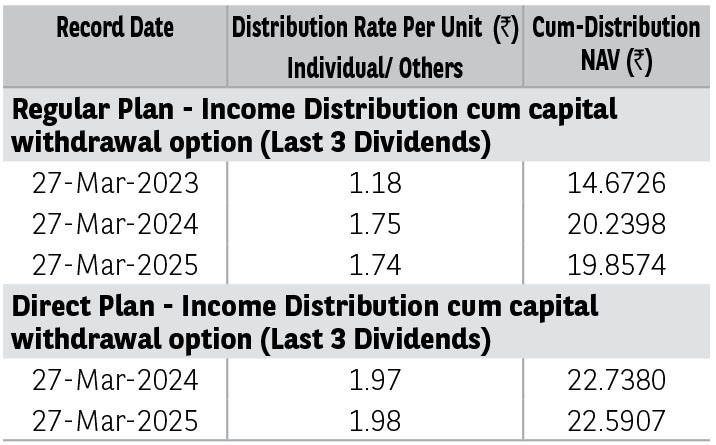 Pursuant to distribution under Income Distribution cum Capital Withdrawal (‘IDCW’) option, NAV of the IDCW option of the scheme(s) would fall to the extent of payout and statutory levy (if applicable). The amounts under IDCW options can be distributed out of investors capital (Equalization Reserve), which is part of sale price that represents realized gains. Past performance may or may not be sustained in future. The above stated distribution rate per unit is net distribution rate after deducting applicable taxes. The above distribution rates are on face value of ₹ 10 per unit.