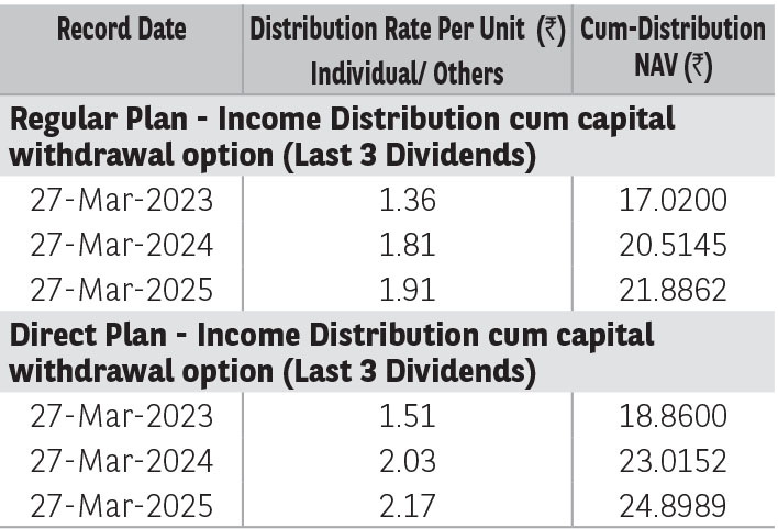 Pursuant to distribution under Income Distribution cum Capital Withdrawal (‘IDCW’) option, NAV of the IDCW option of the scheme(s) would fall to the extent of payout and statutory levy (if applicable). The amounts under IDCW options can be distributed out of investors capital (Equalization Reserve), which is part of sale price that represents realized gains. Past performance may or may not be sustained in future. The above stated distribution rate per unit is net distribution rate after deducting applicable taxes. The above distribution rates are on face value of ₹ 10 per unit.