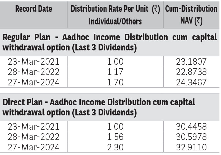 Pursuant to distribution under Income Distribution cum Capital Withdrawal (‘IDCW’) option, NAV of the IDCW option of the scheme(s) would fall to the extent of payout and statutory levy (if applicable). The amounts under IDCW options can be distributed out of investors capital (Equalization Reserve), which is part of sale price that represents realized gains. Past performance may or may not be sustained in future. The above stated distribution rate per unit is net distribution rate after deducting applicable taxes. The above distribution rates are on face value of ₹ 10 per unit.