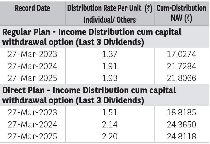 Pursuant to distribution under Income Distribution cum Capital Withdrawal (‘IDCW’) option, NAV of the IDCW option of the scheme(s) would fall to the extent of payout and statutory levy (if applicable). The amounts under IDCW options can be distributed out of investors capital (Equalization Reserve), which is part of sale price that represents realized gains. Past performance may or may not be sustained in future. The above stated distribution rate per unit is net distribution rate after deducting applicable taxes. The above distribution rates are on face value of ₹ 10 per unit.