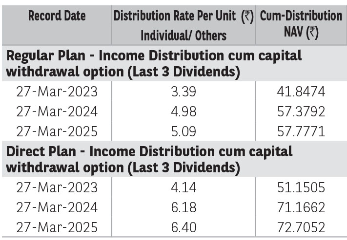 Pursuant to distribution under Income Distribution cum Capital Withdrawal (‘IDCW’) option, NAV of the IDCW option of the scheme(s) would fall to the extent of payout and statutory levy (if applicable). The amounts under IDCW options can be distributed out of investors capital (Equalization Reserve), which is part of sale price that represents realized gains. Past performance may or may not be sustained in future. The above stated distribution rate per unit is net distribution rate after deducting applicable taxes. The above distribution rates are on face value of ₹ 10 per unit.