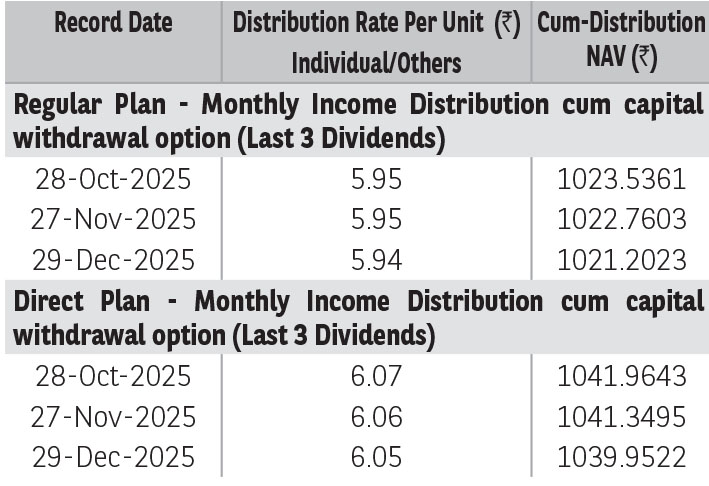 amounts under IDCW options can be distributed out of investors capital (Equalization Reserve), which is part of sale price that represents realized gains. Past performance may or may not be sustained in future.The above stated distribution rate per unit is net distribution rate after deducting applicable taxes. The above distribution rates are on face value of ₹ 10 per unit.