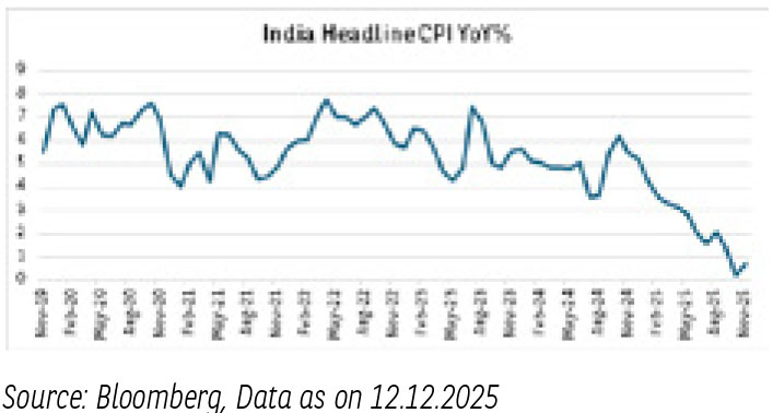 - CPI inflation picked up tad bit at 0.7% in November-2025 v/s