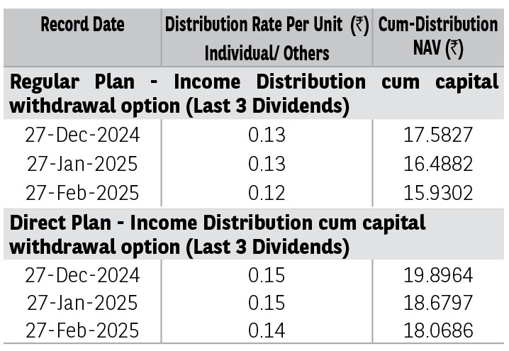 Pursuant to distribution under Income Distribution cum Capital Withdrawal (‘IDCW’) option, NAV of the IDCW option of the scheme(s) would fall to the extent of payout and statutory levy (if applicable). The amounts under IDCW options can be distributed out of investors capital (Equalization Reserve), which is part of sale price that represents realized gains. Past performance may or may not be sustained in future. The above stated distribution rate per unit is net distribution rate after deducting applicable taxes. The above distribution rates are on face value of ₹ 10 per unit.