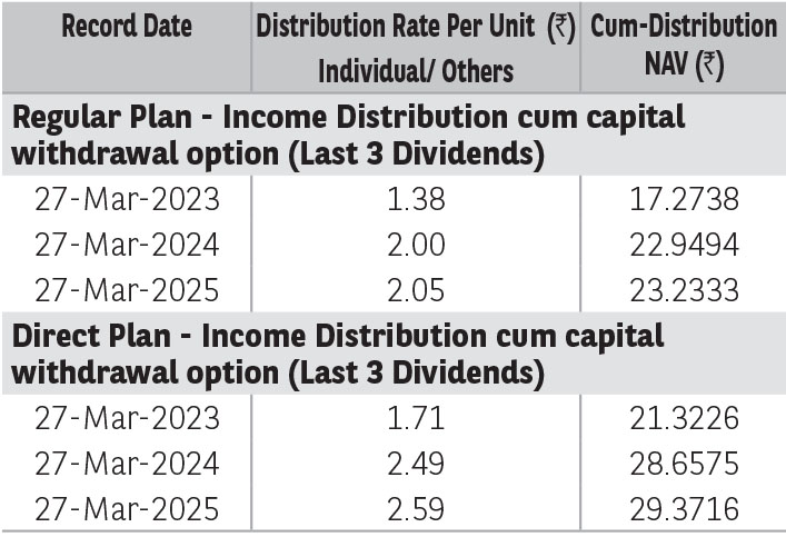 Pursuant to distribution under Income Distribution cum Capital Withdrawal (‘IDCW’) option, NAV of the IDCW option of the scheme(s) would fall to the extent of payout and statutory levy (if applicable). The amounts under IDCW options can be distributed out of investors capital (Equalization Reserve), which is part of sale price that represents realized gains. Past performance may or may not be sustained in future. The above stated distribution rate per unit is net distribution rate after deducting applicable taxes. The above distribution rates are on face value of ₹ 10 per unit.