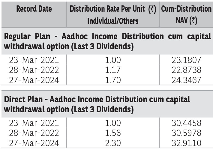 Pursuant to distribution under Income Distribution cum Capital Withdrawal (‘IDCW’) option, NAV of the IDCW option of the scheme(s) would fall to the extent of payout and statutory levy (if applicable). The amounts under IDCW options can be distributed out of investors capital (Equalization Reserve), which is part of sale price that represents realized gains. Past performance may or may not be sustained in future. The above stated distribution rate per unit is net distribution rate after deducting applicable taxes. The above distribution rates are on face value of ₹ 10 per unit.