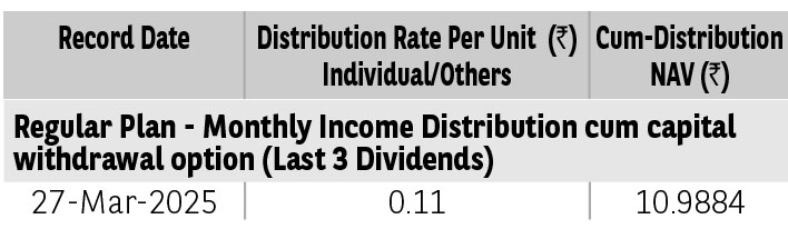 Pursuant to distribution under Income Distribution cum Capital Withdrawal (‘IDCW’) option, NAV of the IDCW option of the scheme(s) would fall to the extent of payout and statutory levy (if applicable). The amounts under IDCW options can be distributed out of investors capital (Equalization Reserve), which is part of sale price that represents realized gains. Past performance may or may not be sustained in future. The above stated distribution rate per unit is net distribution rate after deducting applicable taxes. The above distribution rates are on face value of ₹ 10 per unit.