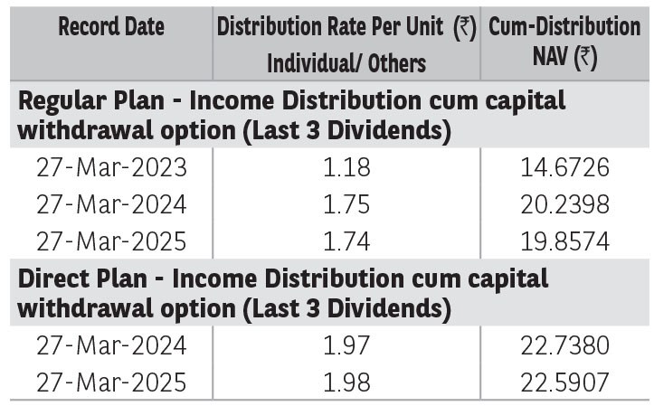 Pursuant to distribution under Income Distribution cum Capital Withdrawal (‘IDCW’) option, NAV of the IDCW option of the scheme(s) would fall to the extent of payout and statutory levy (if applicable). The amounts under IDCW options can be distributed out of investors capital (Equalization Reserve), which is part of sale price that represents realized gains. Past performance may or may not be sustained in future. The above stated distribution rate per unit is net distribution rate after deducting applicable taxes. The above distribution rates are on face value of ₹ 10 per unit.