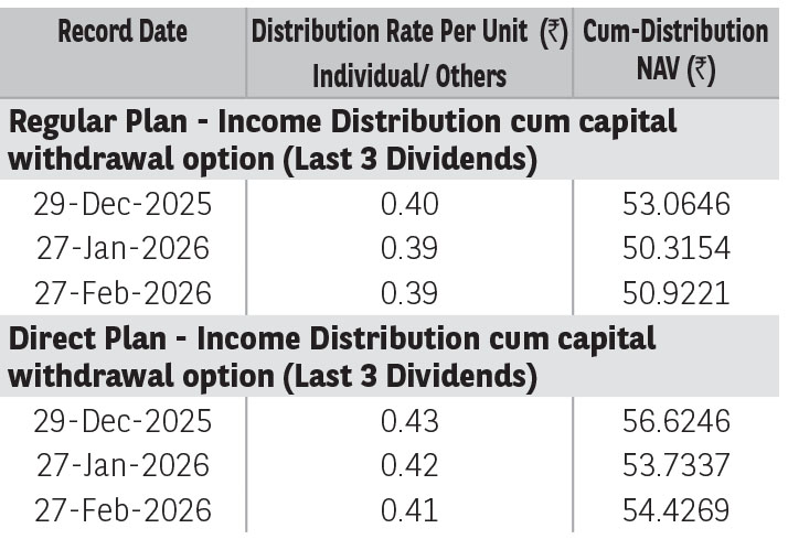 Pursuant to distribution under Income Distribution cum Capital Withdrawal (‘IDCW’) option, NAV of the IDCW option of the scheme(s) would fall to the extent of payout and statutory levy (if applicable). The amounts under IDCW options can be distributed out of investors capital (Equalization Reserve), which is part of sale price that represents realized gains. Past performance may or may not be sustained in future. The above stated distribution rate per unit is net distribution rate after deducting applicable taxes. The above distribution rates are on face value of ₹ 10 per unit.