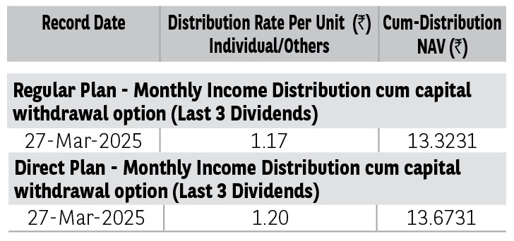 Pursuant to distribution under Income Distribution cum Capital Withdrawal (‘IDCW’) option, NAV of the IDCW option of the scheme(s) would fall to the extent of payout and statutory levy (if applicable). The amounts under IDCW options can be distributed out of investors capital (Equalization Reserve), which is part of sale price that represents realized gains. Past performance may or may not be sustained in future. The above stated distribution rate per unit is net distribution rate after deducting applicable taxes. The above distribution rates are on face value of ₹ 10 per unit.
