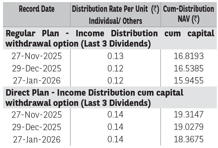 Pursuant to distribution under Income Distribution cum Capital Withdrawal (‘IDCW’) option, NAV of the IDCW option of the scheme(s) would fall to the extent of payout and statutory levy (if applicable). The amounts under IDCW options can be distributed out of investors capital (Equalization Reserve), which is part of sale price that represents realized gains. Past performance may or may not be sustained in future. The above stated distribution rate per unit is net distribution rate after deducting applicable taxes. The above distribution rates are on face value of ₹ 10 per unit.