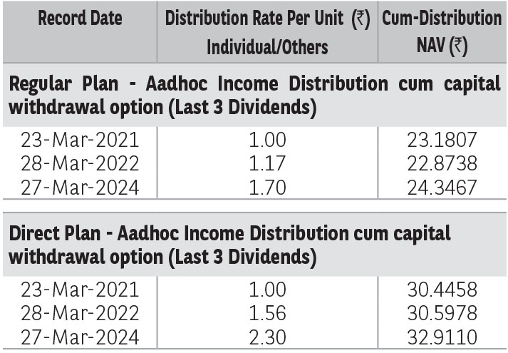 Pursuant to distribution under Income Distribution cum Capital Withdrawal (‘IDCW’) option, NAV of the IDCW option of the scheme(s) would fall to the extent of payout and statutory levy (if applicable). The amounts under IDCW options can be distributed out of investors capital (Equalization Reserve), which is part of sale price that represents realized gains. Past performance may or may not be sustained in future. The above stated distribution rate per unit is net distribution rate after deducting applicable taxes. The above distribution rates are on face value of ₹ 10 per unit.