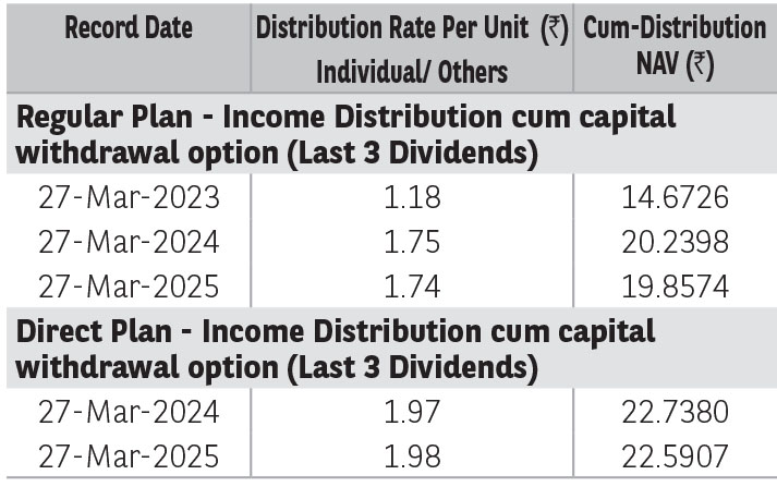 Pursuant to distribution under Income Distribution cum Capital Withdrawal (‘IDCW’) option, NAV of the IDCW option of the scheme(s) would fall to the extent of payout and statutory levy (if applicable). The amounts under IDCW options can be distributed out of investors capital (Equalization Reserve), which is part of sale price that represents realized gains. Past performance may or may not be sustained in future. The above stated distribution rate per unit is net distribution rate after deducting applicable taxes. The above distribution rates are on face value of ₹ 10 per unit.