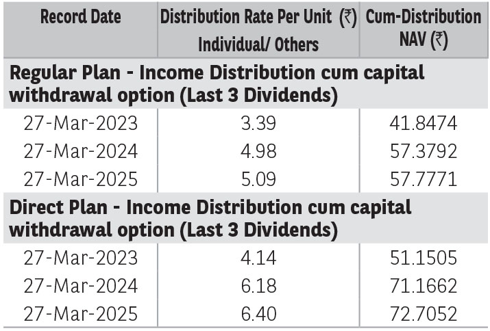 Pursuant to distribution under Income Distribution cum Capital Withdrawal (‘IDCW’) option, NAV of the IDCW option of the scheme(s) would fall to the extent of payout and statutory levy (if applicable). The amounts under IDCW options can be distributed out of investors capital (Equalization Reserve), which is part of sale price that represents realized gains. Past performance may or may not be sustained in future. The above stated distribution rate per unit is net distribution rate after deducting applicable taxes. The above distribution rates are on face value of ₹ 10 per unit.