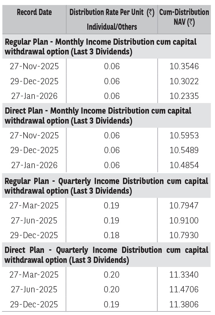 NAV Details (As on January 30, 2026)| Regular Plan - Quarterly IDCW Option | : ₹10.6097 |