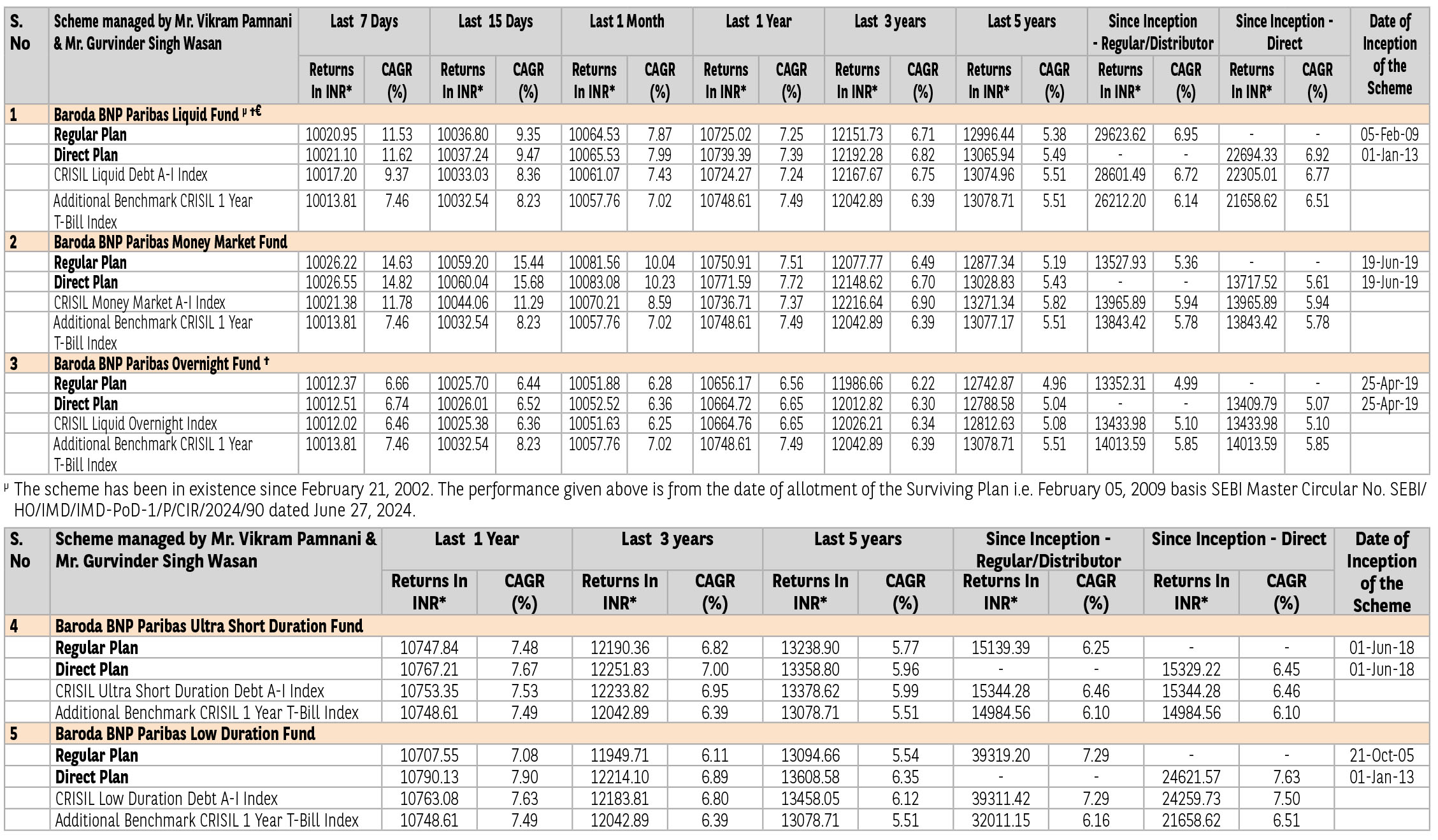 μμ The inception date of Baroda BNP Paribas Corporate Bond Fund is November 8, 2008. However, since there was no continuous NAV history available for this plan prior to May 10, 2010, the point to point return from since inception may not be the true