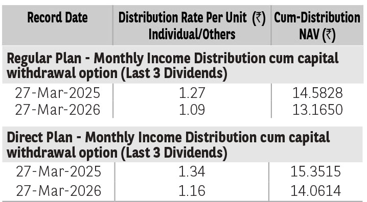 Pursuant to distribution under Income Distribution cum Capital Withdrawal (‘IDCW’) option, NAV of the IDCW option of the scheme(s) would fall to the extent of payout and statutory levy (if applicable). The amounts under IDCW options can be distributed out of investors capital (Equalization Reserve), which is part of sale price that represents realized gains. Past performance may or may not be sustained in future. The above stated distribution rate per unit is net distribution rate after deducting applicable taxes. The above distribution rates are on face value of ₹ 10 per unit.