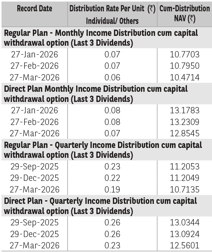 Pursuant to distribution under Income Distribution cum Capital Withdrawal (‘IDCW’) option, NAV of the IDCW option of the scheme(s) would fall to the extent of payout and statutory levy (if applicable). The amounts under IDCW options can be distributed out of investors capital (Equalization Reserve), which is part of sale price that represents realized gains. Past performance may or may not be sustained in future. The above stated distribution rate per unit is net distribution rate after deducting applicable taxes. The above distribution rates are on face value of ₹ 10 per unit.