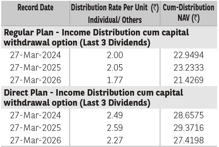 Pursuant to distribution under Income Distribution cum Capital Withdrawal (‘IDCW’) option, NAV of the IDCW option of the scheme(s) would fall to the extent of payout and statutory levy (if applicable). The amounts under IDCW options can be distributed out of investors capital (Equalization Reserve), which is part of sale price that represents realized gains. Past performance may or may not be sustained in future. The above stated distribution rate per unit is net distribution rate after deducting applicable taxes. The above distribution rates are on face value of ₹ 10 per unit.