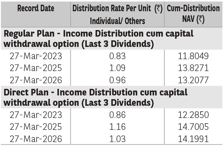 Pursuant to distribution under Income Distribution cum Capital Withdrawal (‘IDCW’) option, NAV of the IDCW option of the scheme(s) would fall to the extent of payout and statutory levy (if applicable). The amounts under IDCW options can be distributed out of investors capital (Equalization Reserve), which is part of sale price that represents realized gains. Past performance may or may not be sustained in future. The above stated distribution rate per unit is net distribution rate after deducting applicable taxes. The above distribution rates are on face value of ₹ 10 per unit.