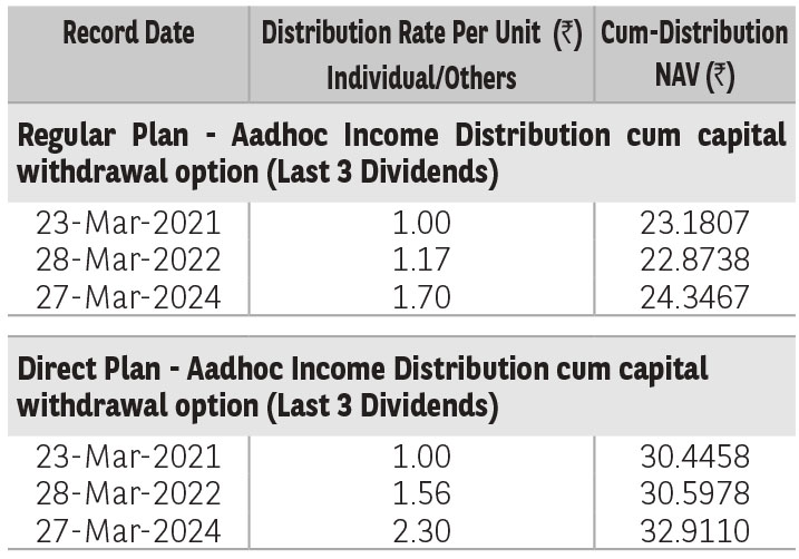 Pursuant to distribution under Income Distribution cum Capital Withdrawal (‘IDCW’) option, NAV of the IDCW option of the scheme(s) would fall to the extent of payout and statutory levy (if applicable). The amounts under IDCW options can be distributed out of investors capital (Equalization Reserve), which is part of sale price that represents realized gains. Past performance may or may not be sustained in future. The above stated distribution rate per unit is net distribution rate after deducting applicable taxes. The above distribution rates are on face value of ₹ 10 per unit.