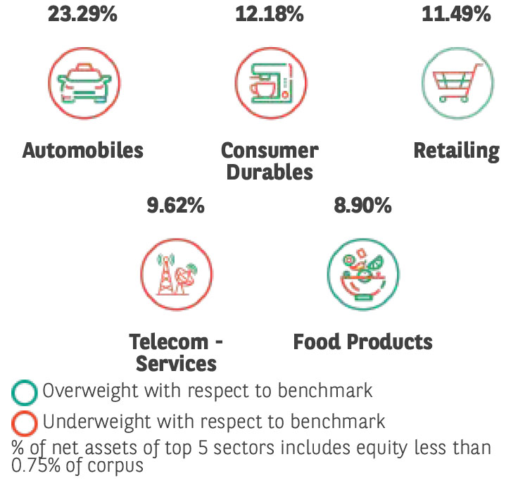 ➤ Investment primarily in equity and equity related securities and the rest in debt securities & money market instruments to generate capital appreciation and provide long-term growth opportunities by investing in companies expected to benefit by providing products and services to the growing consumption needs of Indian consumers.