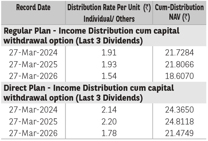 Pursuant to distribution under Income Distribution cum Capital Withdrawal (‘IDCW’) option, NAV of the IDCW option of the scheme(s) would fall to the extent of payout and statutory levy (if applicable). The amounts under IDCW options can be distributed out of investors capital (Equalization Reserve), which is part of sale price that represents realized gains. Past performance may or may not be sustained in future. The above stated distribution rate per unit is net distribution rate after deducting applicable taxes. The above distribution rates are on face value of ₹ 10 per unit.
