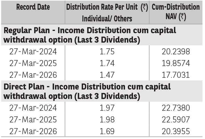 Pursuant to distribution under Income Distribution cum Capital Withdrawal (‘IDCW’) option, NAV of the IDCW option of the scheme(s) would fall to the extent of payout and statutory levy (if applicable). The amounts under IDCW options can be distributed out of investors capital (Equalization Reserve), which is part of sale price that represents realized gains. Past performance may or may not be sustained in future. The above stated distribution rate per unit is net distribution rate after deducting applicable taxes. The above distribution rates are on face value of ₹ 10 per unit.