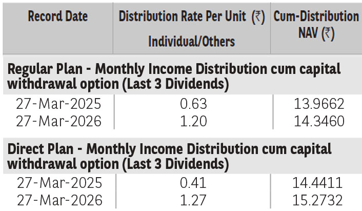 Pursuant to distribution under Income Distribution cum Capital Withdrawal (‘IDCW’) option, NAV of the IDCW option of the scheme(s) would fall to the extent of payout and statutory levy (if applicable). The amounts under IDCW options can be distributed out of investors capital (Equalization Reserve), which is part of sale price that represents realized gains. Past performance may or may not be sustained in future. The above stated distribution rate per unit is net distribution rate after deducting applicable taxes. The above distribution rates are on face value of ₹ 10 per unit.