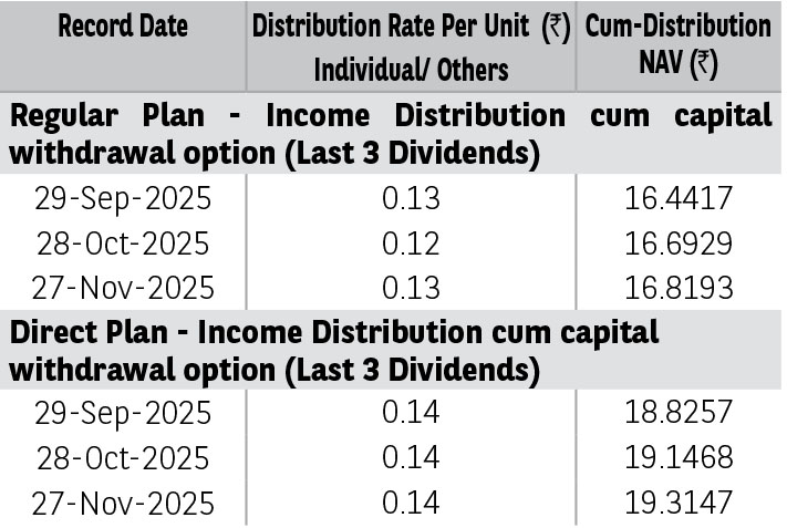 Pursuant to distribution under Income Distribution cum Capital Withdrawal (‘IDCW’) option, NAV of the IDCW option of the scheme(s) would fall to the extent of payout and statutory levy (if applicable). The amounts under IDCW options can be distributed out of investors capital (Equalization Reserve), which is part of sale price that represents realized gains. Past performance may or may not be sustained in future. The above stated distribution rate per unit is net distribution rate after deducting applicable taxes. The above distribution rates are on face value of ₹ 10 per unit.