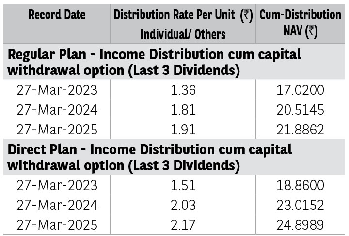 Pursuant to distribution under Income Distribution cum Capital Withdrawal (‘IDCW’) option, NAV of the IDCW option of the scheme(s) would fall to the extent of payout and statutory levy (if applicable). The amounts under IDCW options can be distributed out of investors capital (Equalization Reserve), which is part of sale price that represents realized gains. Past performance may or may not be sustained in future. The above stated distribution rate per unit is net distribution rate after deducting applicable taxes. The above distribution rates are on face value of ₹ 10 per unit.