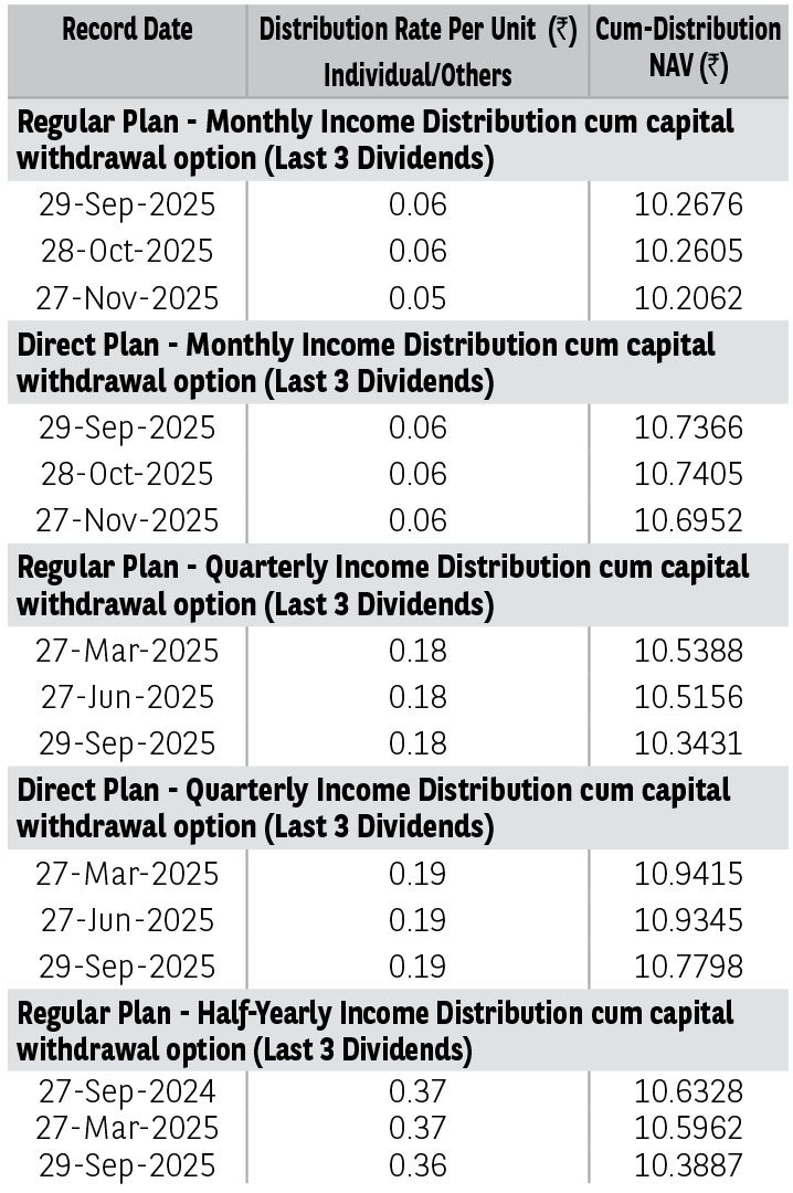 NAV Details (As on November 28, 2025)| Regular Plan - Weekly IDCW Option | : ₹ 9.9773 |