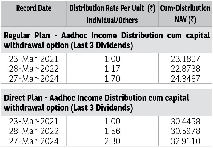 Pursuant to distribution under Income Distribution cum Capital Withdrawal (‘IDCW’) option, NAV of the IDCW option of the scheme(s) would fall to the extent of payout and statutory levy (if applicable). The amounts under IDCW options can be distributed out of investors capital (Equalization Reserve), which is part of sale price that represents realized gains. Past performance may or may not be sustained in future. The above stated distribution rate per unit is net distribution rate after deducting applicable taxes. The above distribution rates are on face value of ₹ 10 per unit.