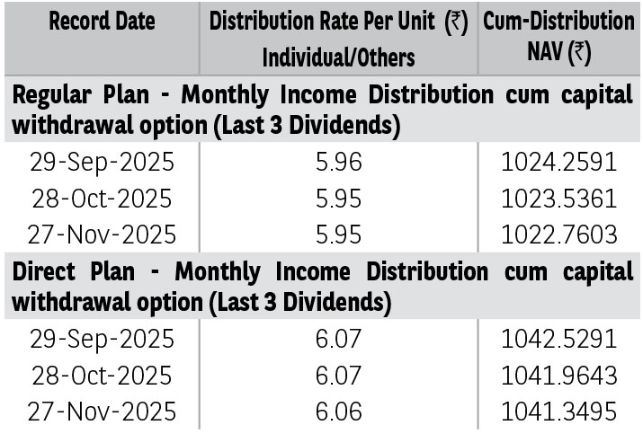 amounts under IDCW options can be distributed out of investors capital (Equalization Reserve), which is part of sale price that represents realized gains. Past performance may or may not be sustained in future.The above stated distribution rate per unit is net distribution rate after deducting applicable taxes. The above distribution rates are on face value of ₹ 10 per unit.