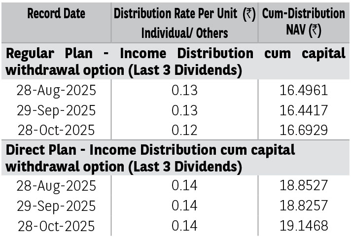 Pursuant to distribution under Income Distribution cum Capital Withdrawal (‘IDCW’) option, NAV of the IDCW option of the scheme(s) would fall to the extent of payout and statutory levy (if applicable). The amounts under IDCW options can be distributed out of investors capital (Equalization Reserve), which is part of sale price that represents realized gains. Past performance may or may not be sustained in future. The above stated distribution rate per unit is net distribution rate after deducting applicable taxes. The above distribution rates are on face value of ₹ 10 per unit.