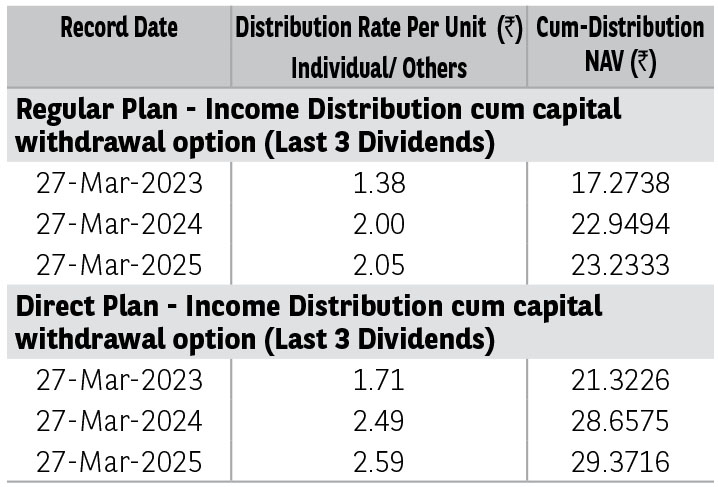 Pursuant to distribution under Income Distribution cum Capital Withdrawal (‘IDCW’) option, NAV of the IDCW option of the scheme(s) would fall to the extent of payout and statutory levy (if applicable). The amounts under IDCW options can be distributed out of investors capital (Equalization Reserve), which is part of sale price that represents realized gains. Past performance may or may not be sustained in future. The above stated distribution rate per unit is net distribution rate after deducting applicable taxes. The above distribution rates are on face value of ₹ 10 per unit.