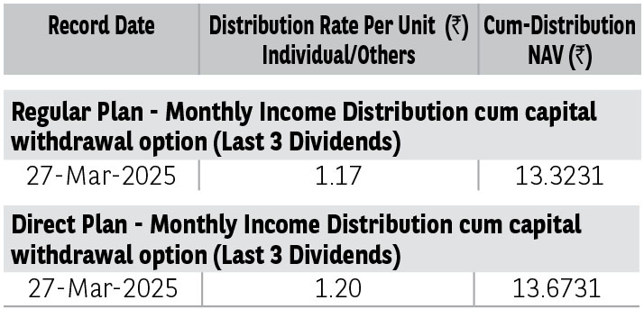Pursuant to distribution under Income Distribution cum Capital Withdrawal (‘IDCW’) option, NAV of the IDCW option of the scheme(s) would fall to the extent of payout and statutory levy (if applicable). The amounts under IDCW options can be distributed out of investors capital (Equalization Reserve), which is part of sale price that represents realized gains. Past performance may or may not be sustained in future. The above stated distribution rate per unit is net distribution rate after deducting applicable taxes. The above distribution rates are on face value of ₹ 10 per unit.
