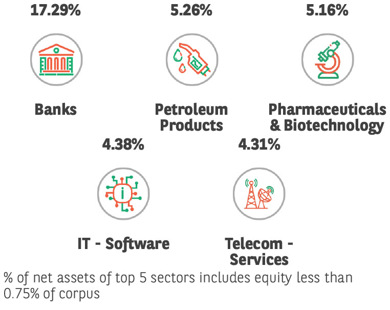 Investment in Top 10 scrips constitutes 30.98% of the portfolio Net equity holdings is 76.75% of the portfolio
