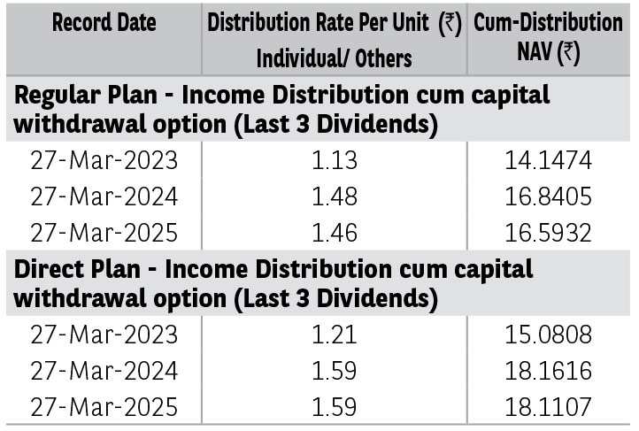 Pursuant to distribution under Income Distribution cum Capital Withdrawal (‘IDCW’) option, NAV of the IDCW option of the scheme(s) would fall to the extent of payout and statutory levy (if applicable). The amounts under IDCW options can be distributed out of investors capital (Equalization Reserve), which is part of sale price that represents realized gains. Past performance may or may not be sustained in future. The above stated distribution rate per unit is net distribution rate after deducting applicable taxes. The above distribution rates are on face value of ₹ 10 per unit.
