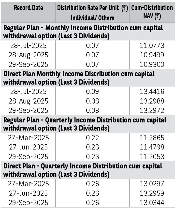 Pursuant to distribution under Income Distribution cum Capital Withdrawal (‘IDCW’) option, NAV of the IDCW option of the scheme(s) would fall to the extent of payout and statutory levy (if applicable). The amounts under IDCW options can be distributed out of investors capital (Equalization Reserve), which is part of sale price that represents realized gains. Past performance may or may not be sustained in future. The above stated distribution rate per unit is net distribution rate after deducting applicable taxes. The above distribution rates are on face value of ₹ 10 per unit.