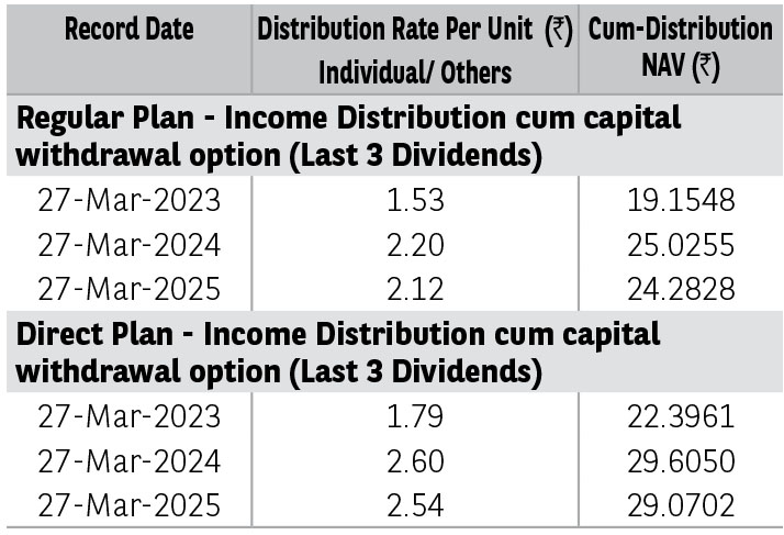 Pursuant to distribution under Income Distribution cum Capital Withdrawal (‘IDCW’) option, NAV of the IDCW option of the scheme(s) would fall to the extent of payout and statutory levy (if applicable). The amounts under IDCW options can be distributed out of investors capital (Equalization Reserve), which is part of sale price that represents realized gains. Past performance may or may not be sustained in future. The above stated distribution rate per unit is net distribution rate after deducting applicable taxes. The above distribution rates are on face value of ₹ 10 per unit.
