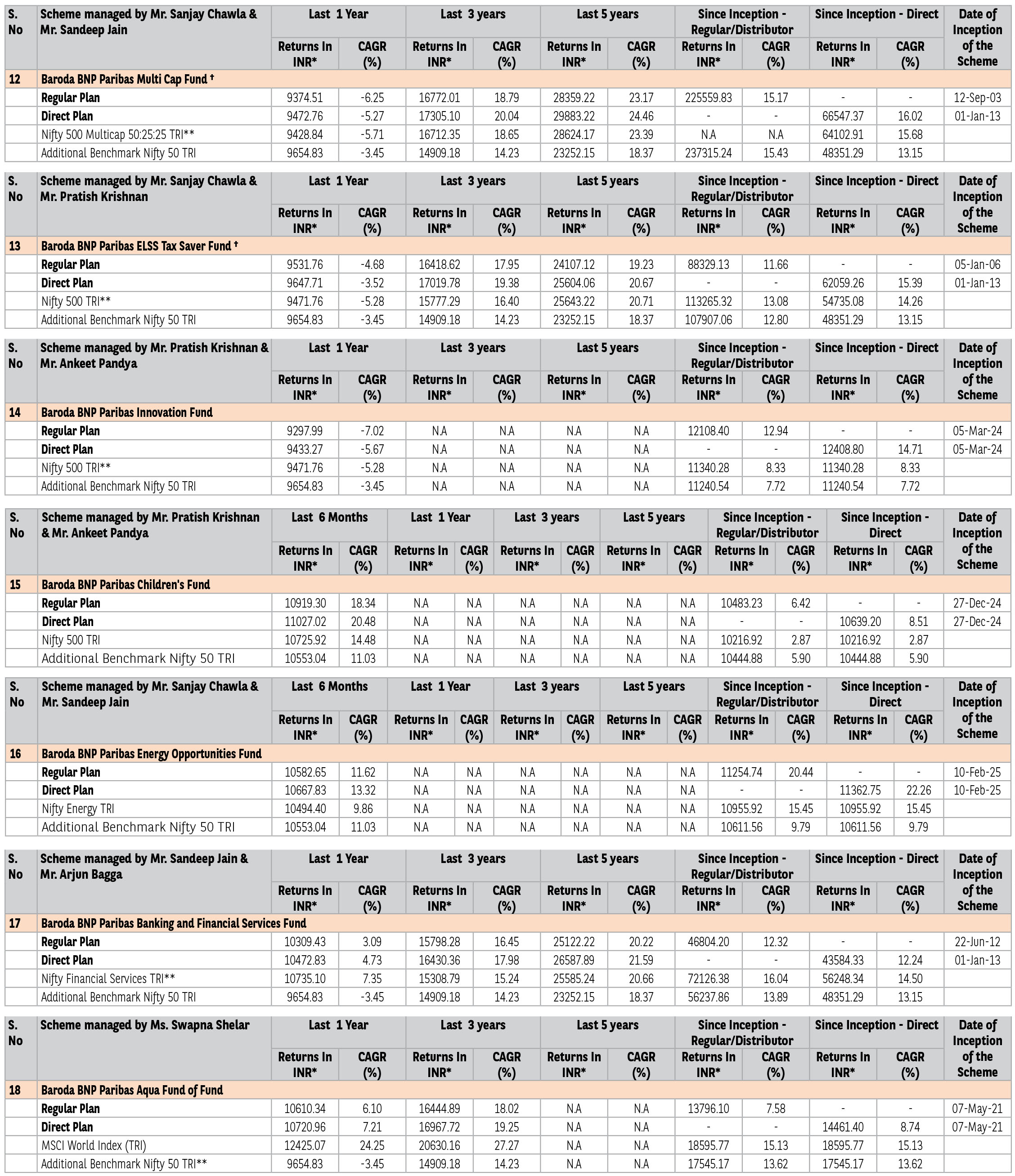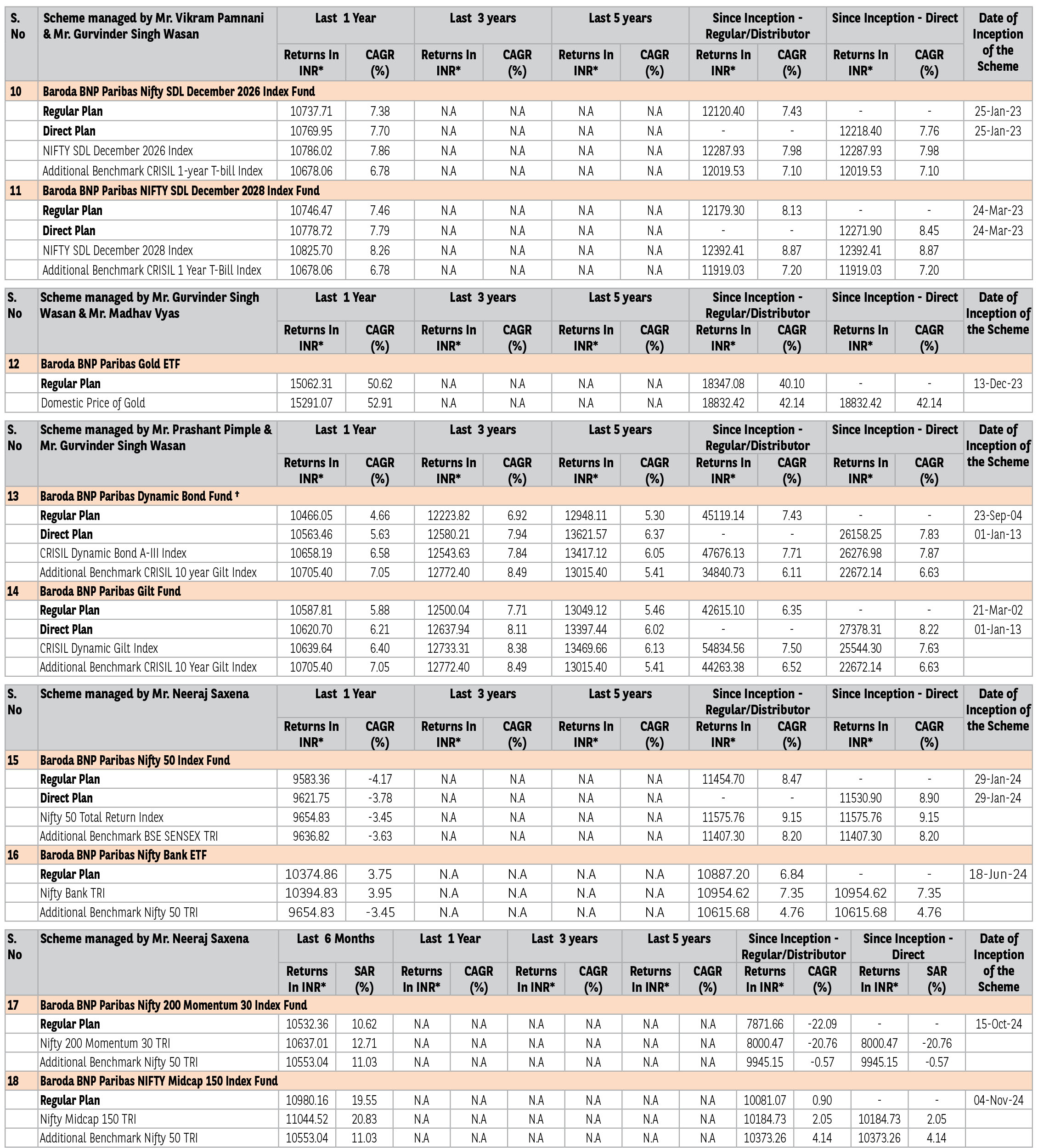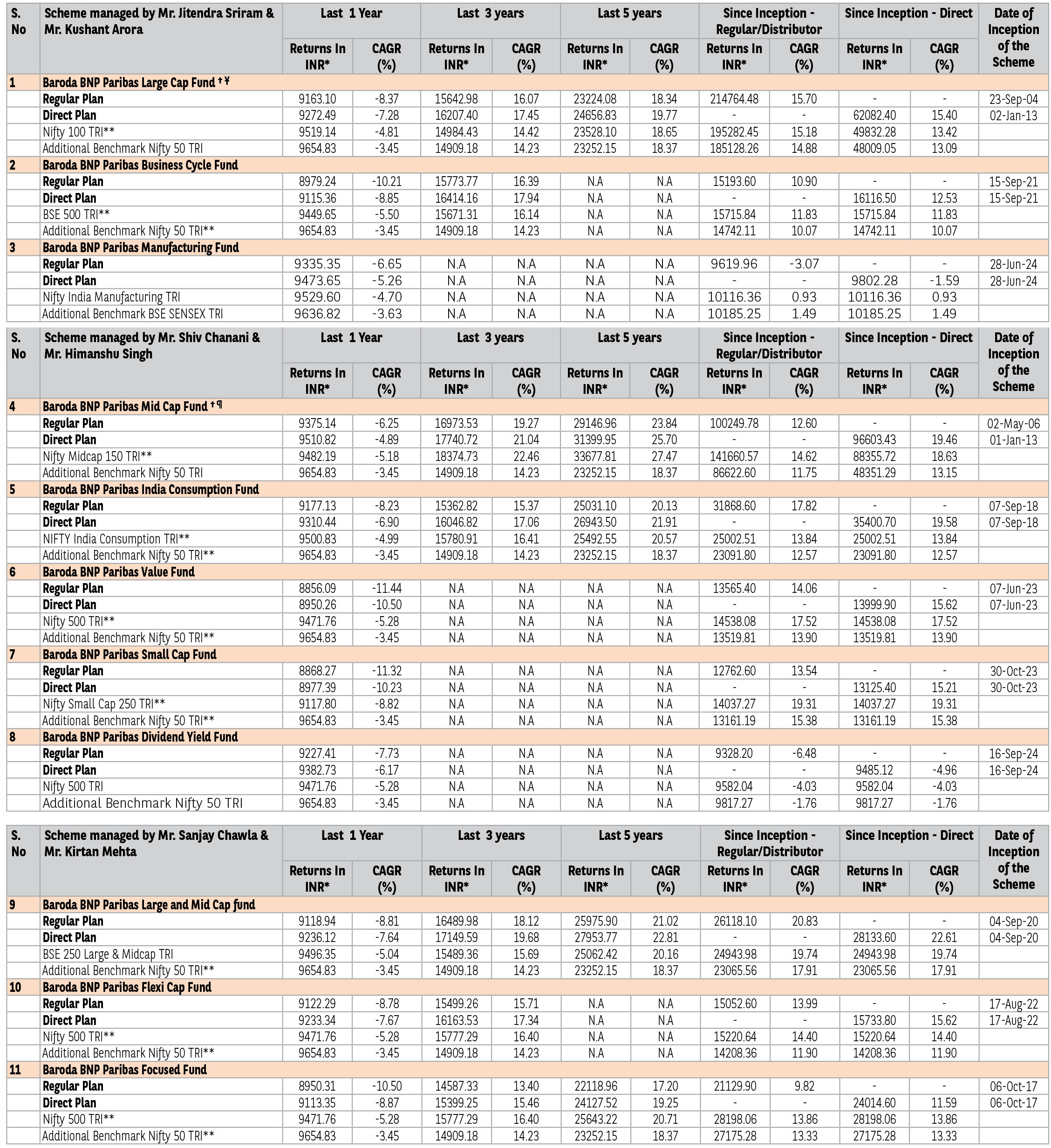 5 years is not available, the same has not been shown. Performance of Baroda BNP Paribas Income Plus Arbitrage Active Fund of Funds, Baroda BNP Paribas Multi Asset Active Fund of Funds and Baroda BNP Paribas Health and Wellness Fund is not provided as the scheme has not completed 6